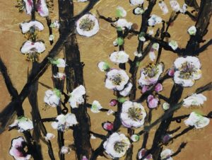 墨とアクリルを用い、金の紙が貼られた色紙に、集中して一気に描き上げた。