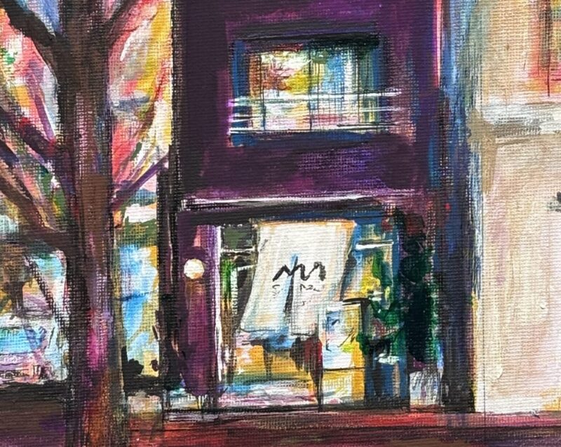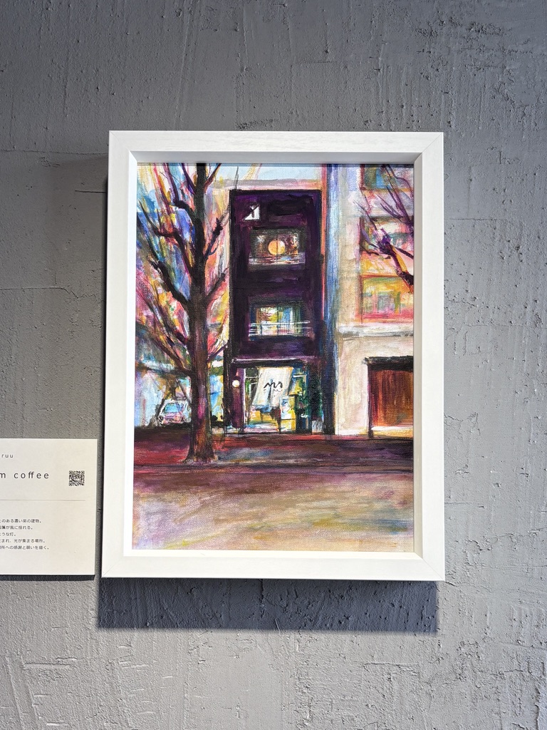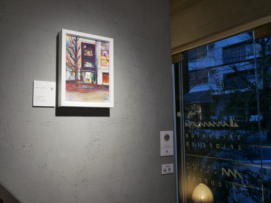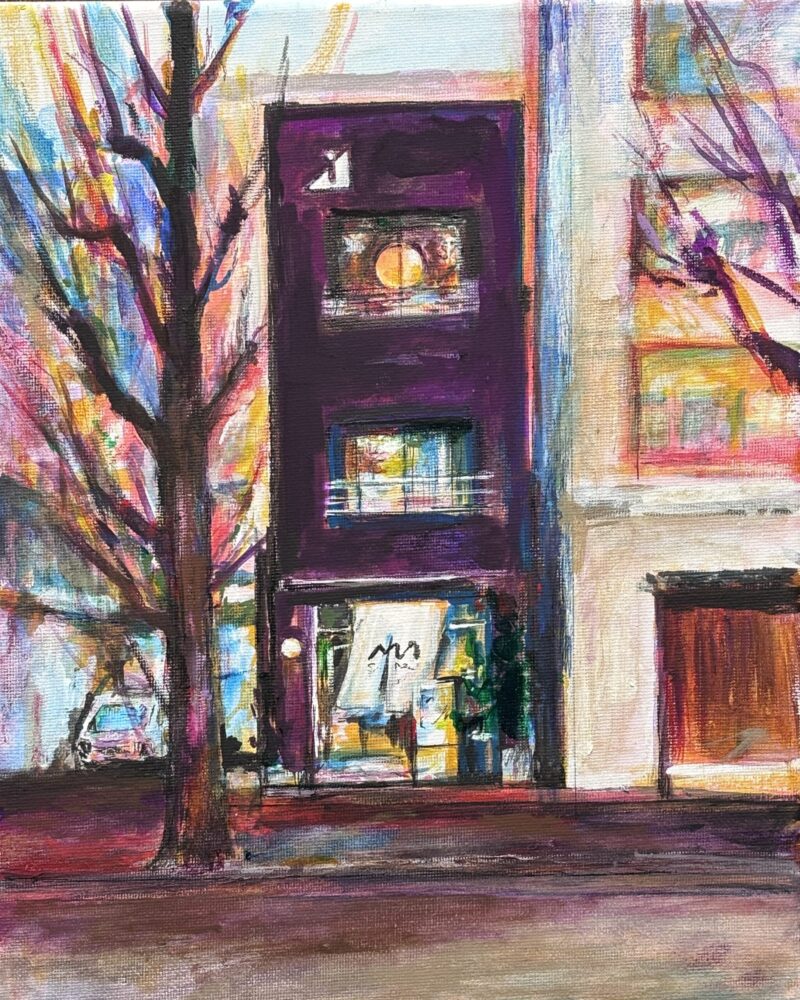 個展会場となった設計事務所1階のカフェの外観を描いた作品です。