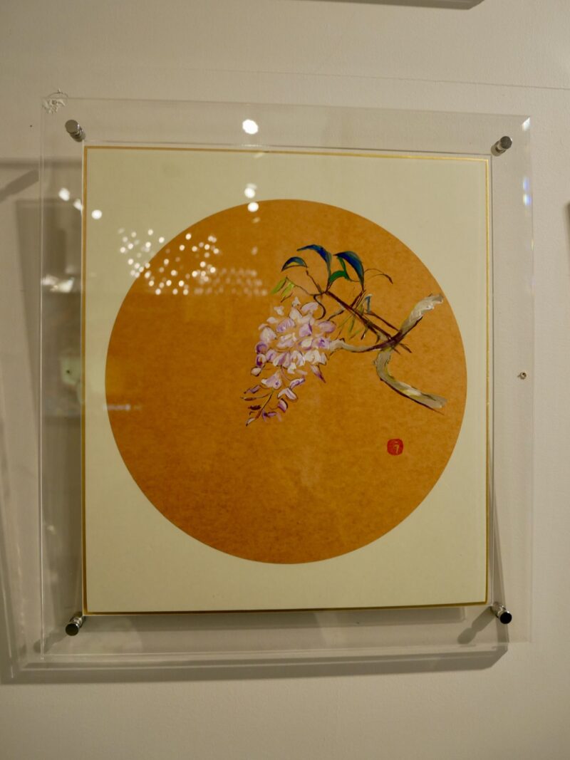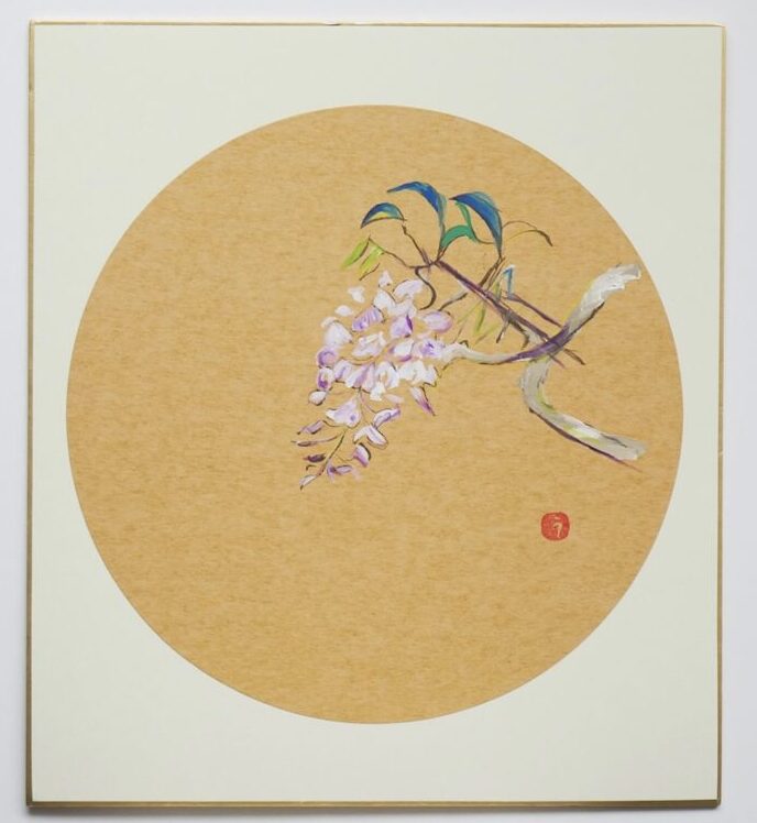 アクリルを用い、金の紙が貼られた色紙に、集中して一気に描き上げ